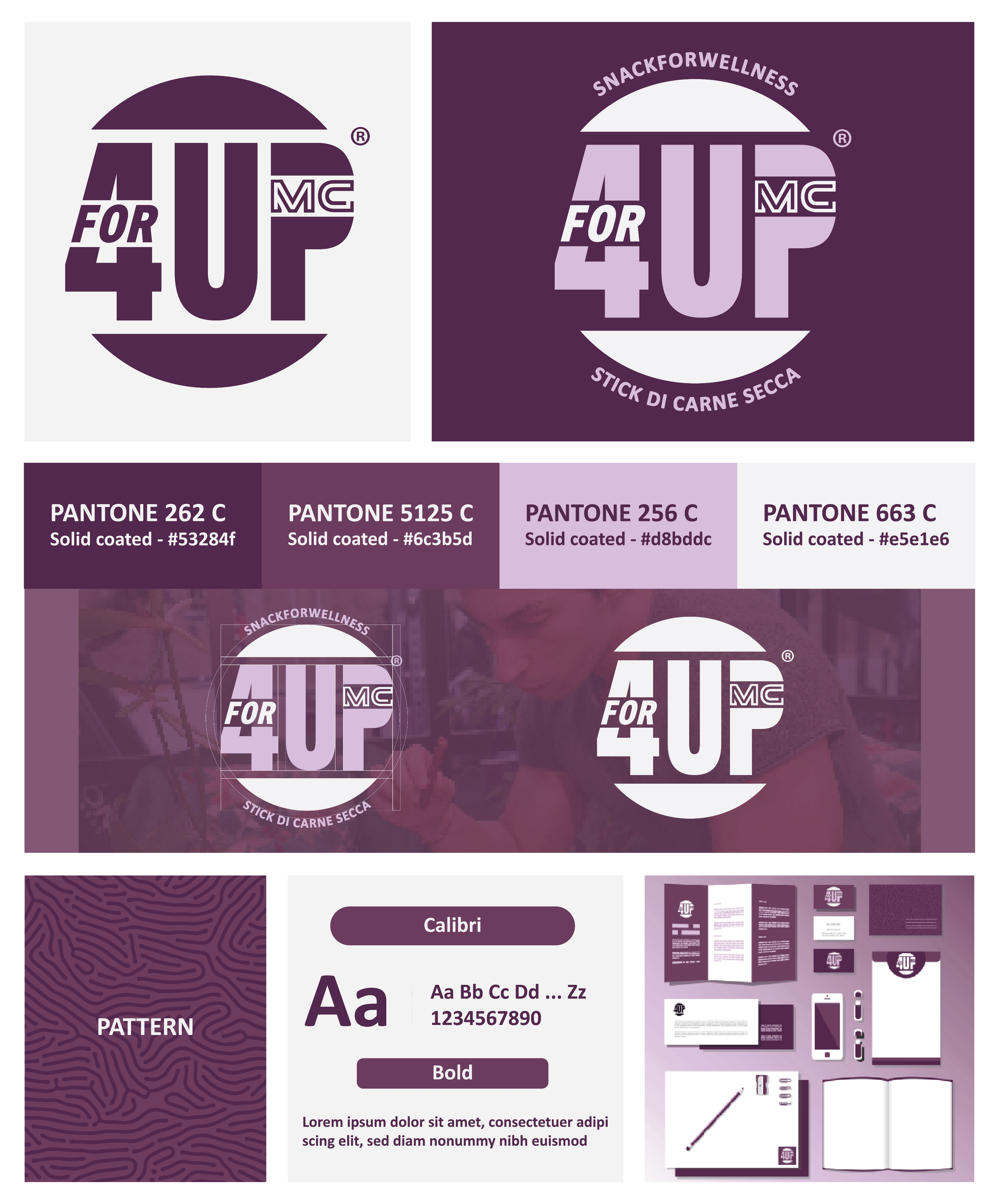 Per 4UP, l’obiettivo era posizionare uno snack proteico della tradizione di Frascati nel settore fitness. Il design si concentra sulla solidità: l’incastro serrato dei glifi comunica la sostanza del prodotto, mentre il '4' integra i pilastri del brand (proteine, praticità, qualità, benessere) in un blocco visivo unico e bilanciato.La forma circolare conferisce equilibrio e completezza, evocando un'identità forte e radicata. La scelta del Pantone 262 C (viola) eleva il marchio, garantendo distinzione cromatica e un'aura di nobiltà rispetto ai competitor. Un'esecuzione tecnica che traduce la qualità della materia prima in un'immagine densa e memorabile.
